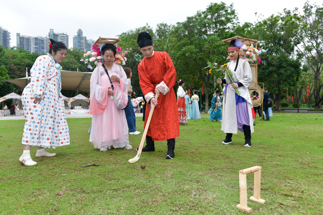 4月2日,2026广州花朝节在珠江公园启幕,本次活动以“花朝逢春序,春意映珠江”为主题。图为穿着汉服的市民体验捶丸。