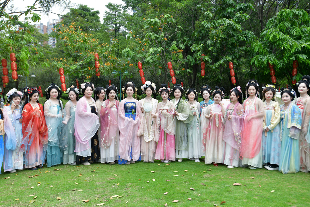 4月2日,2026广州花朝节在珠江公园启幕,本次活动以“花朝逢春序,春意映珠江”为主题。图为穿着汉服的市民开心自拍。