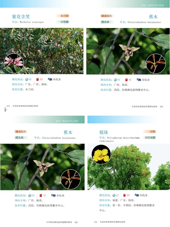 记者近日获悉,《华南国家植物园珍稀濒危植物》出版发行,该书精选了华南国家植物园引种保育的300种特色珍稀濒危植物进行展示,并提供了科、属、国家保护等级、IUCN物种受威胁等级、红色名录等级、CITES附录等级以及保育位置等信息。书中所涉及图片多为园区内拍摄,少数展示效果欠佳的物种采用野外照片予以补充呈现。
