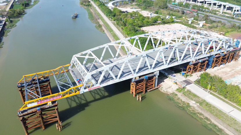 全桥共分为10个大节段,采用“边拼装边顶推”的施工方案,分4次逐步顶推前移。钢桁梁先在岸边的拼装平台一节节拼装完成,随后通过多组液压设备同步发力,像迈步一样平稳地把梁段向前顶送;空出的位置再继续拼接、顶推,如此循环作业,直到钢梁整体跨越江面。