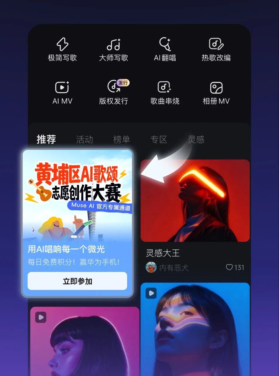 下载Muse AI后,在首页点击banner进入活动页面,领取每日创作特权!