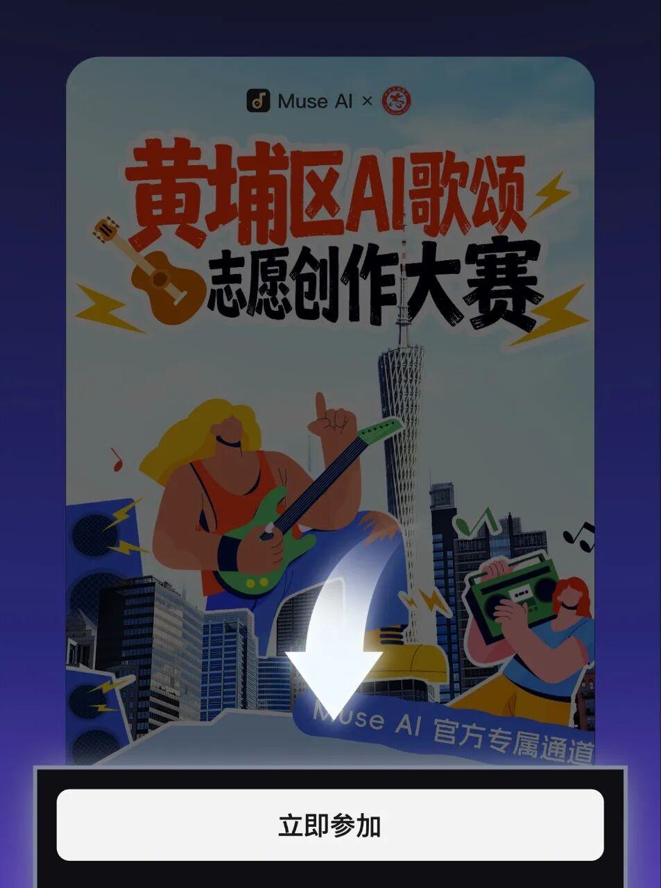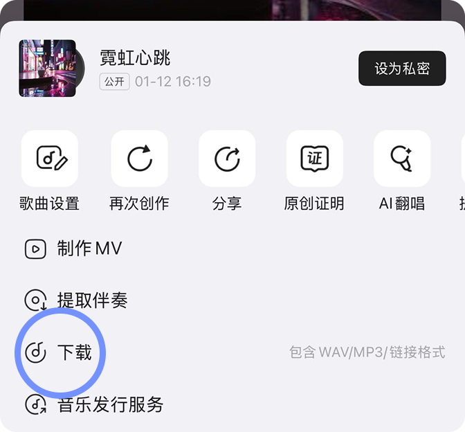 创作完成后,返回活动页面,点击页面下方【立即参加】按钮,选中你满意的作品进行提交,即可免费解锁该歌曲的专属下载通道,将音频保存至手机。