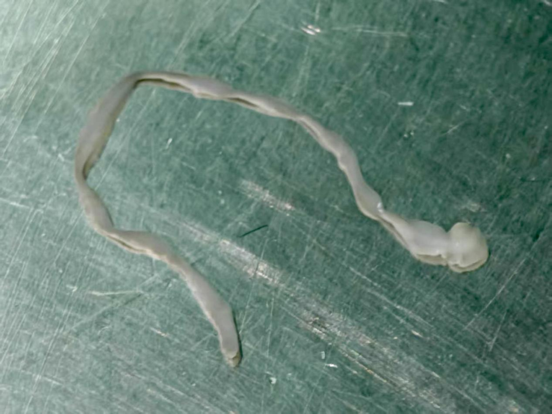 该院神经外五科学科带头人鲁明接诊后,在影像中发现关键线索:病灶不仅位置在移动,还呈现“隧道征”——这是虫体在脑内爬行留下的痕迹。凭借多年“捉虫”经验,鲁明基本确定是脑裂头蚴病。后续血清检查提示裂头蚴抗体阳性。很快,鲁明团队为患者行裂头蚴抓取术,顺利抓到一条8厘米长的活虫。