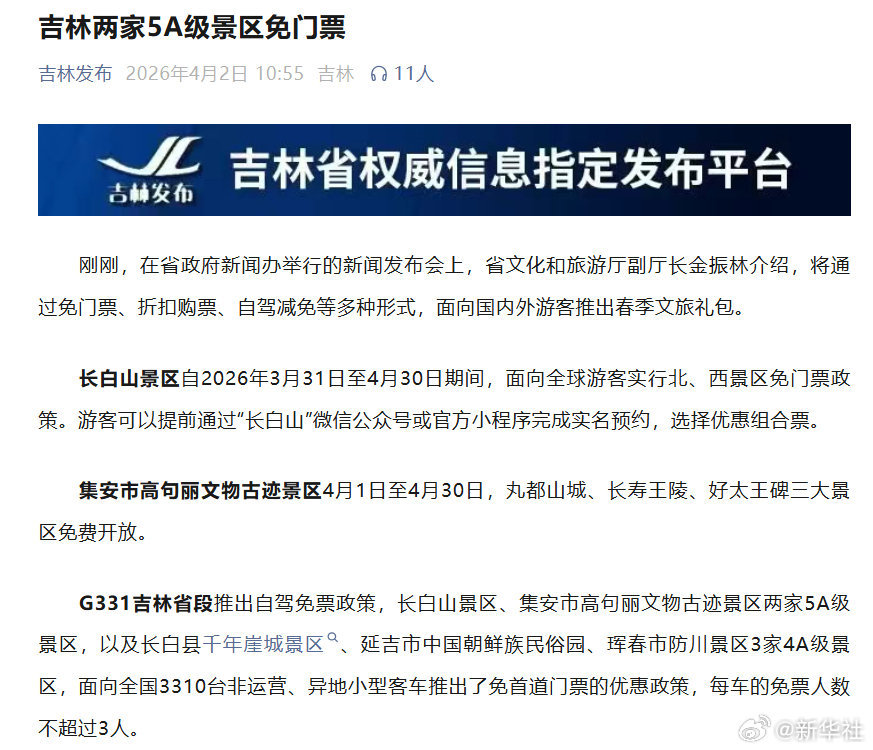 据悉,长白山景区自2026年3月31日至4月30日,面向全球游客实行北、西景区免门票政策。游客可以提前通过“长白山”微信公众号或官方小程序完成实名预约,选择优惠组合票。集安市高句丽文物古迹景区自4月1日至4月30日,丸都山城、长寿王陵、好太王碑三大景区免费开放。