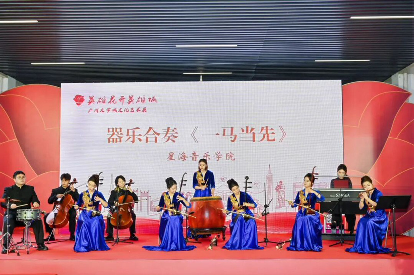 红棉舞台文艺展演同步精彩上演,各高校文艺团队、中小学生艺术团、社区文艺队伍轮番登台,器乐合奏、主题合唱、情景朗诵、原创舞蹈、花毽表演等节目精彩纷呈,《木棉花歌》《英雄花下传薪火 大学城里话担当》《潮涌少年》《我要出色》《英雄》等作品紧扣主题、情感真挚,以艺术之美传递英雄之志,以青春之声唱响时代强音,实现校地共融、同台共舞、全民共享,赢得现场观众阵阵掌声与广泛点赞。