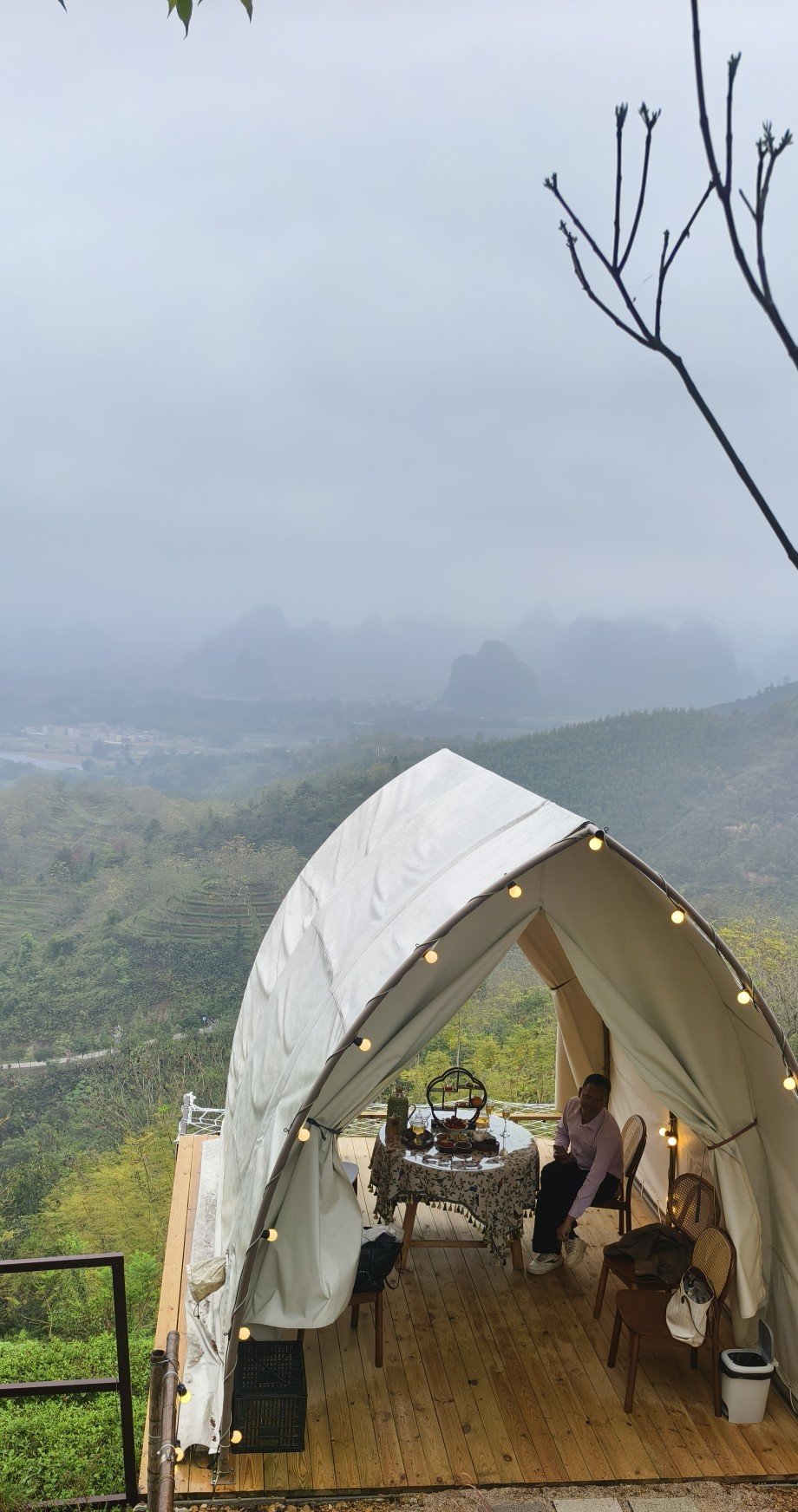 而对在T三峰林茶谷云端露营的游客来说,站在观景台上俯瞰,喀斯特峰林有的像茶壶,有的像巨兽,在云雾中若隐若现,时而被吞没,时而又露出峥嵘,宛如水墨画卷徐徐展开。茶农们背着竹篓穿行在茶垄间,身影在雾气中时隐时现,远远望去,仿佛行走在云端。“这里太惬意了,喝喝茶、赏赏花,什么都不用想,整个人都放松下来了。”从深圳来的刘女士靠在椅背上,闭着眼感受茶园的微风拂面。