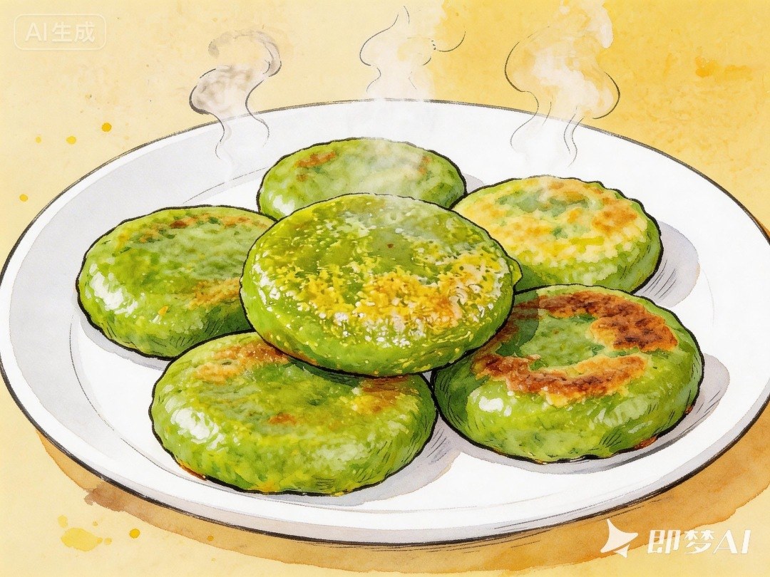 做法:艾草焯水打泥,与糯米粉、白糖混合揉团,分剂子压扁,平底锅刷油煎至两面金黄,起锅即可食用。