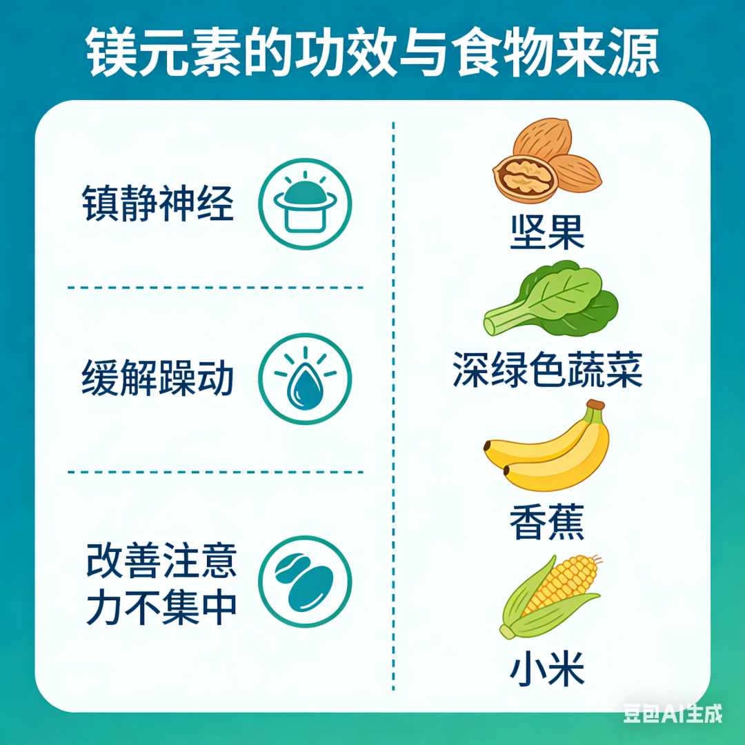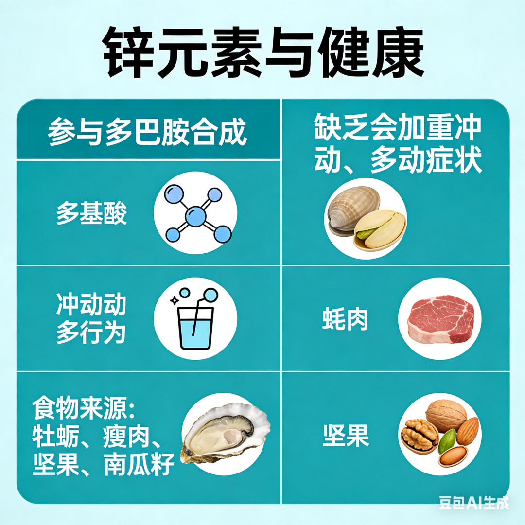 铁、锌、镁、维生素B族等微量元素对神经系统的正常运作至关重要。缺铁可能影响多巴胺受体功能,缺锌则与注意力不集中相关。家长应注意让孩子摄入动物肝脏、瘦肉、坚果、深绿色蔬菜、全谷物等食物,以维持营养均衡。