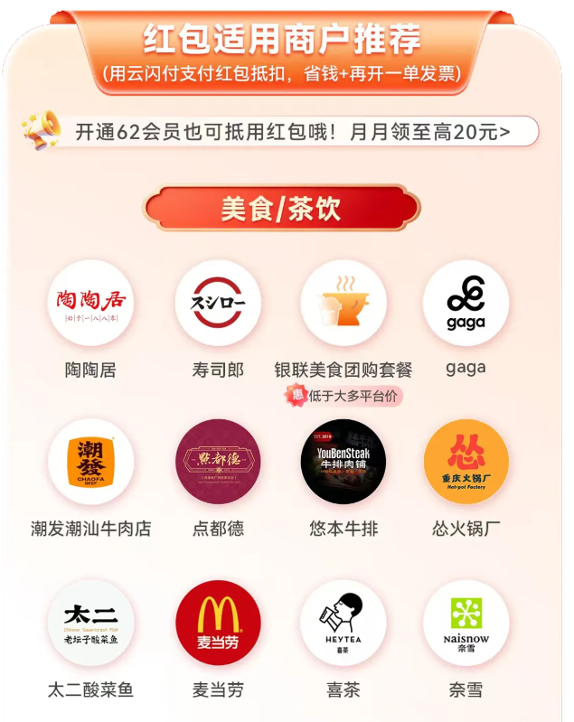 广州市有奖发票活动充分发挥银联支付平台优势,抽奖所得红包在日常线上线下消费中可以随时抵扣使用,不论是线下的美食茶饮、商超零售等高频消费领域,还是线上外卖、电商平台等,让优惠触手可及。