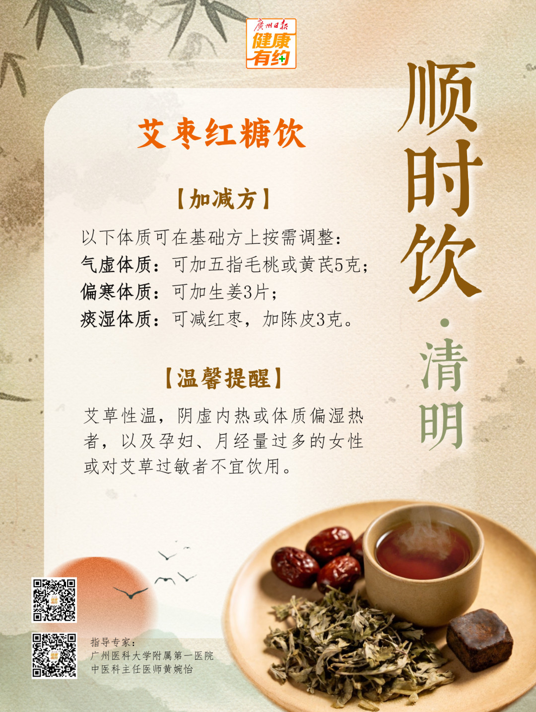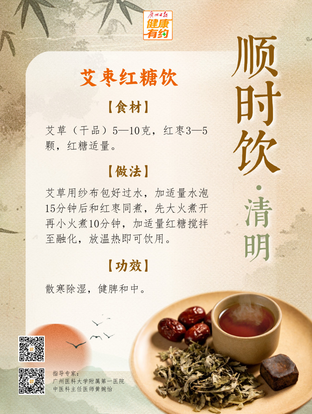 “但考虑到艾叶偏温的特性,在眼下的岭南地区不适合大量食用。我们可以吃一些用艾叶制作的小点心,如艾糍、艾饼,也可以用艾叶煮水泡脚,或适当通过艾灸等帮助散寒除湿、温振阳气。”黄婉怡补充道,还可以尝试本期“顺时饮”为各位推荐的艾枣红糖饮。