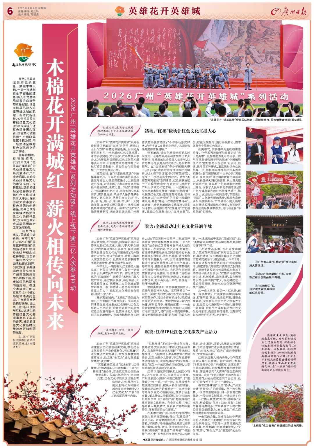 三载蓄力再出发,英雄城内谱新篇。今年3月1日,2026广州“英雄花开英雄城”系列活动在红色殿堂农讲所纪念馆拉开序幕,宣告新一年红色文化主题活动正式铺开;3月29日,系列活动收官重头戏在广州市国防教育中心燃情上演,将全城红色热潮推向新高潮。在这个木棉盛开的火红三月,34个核心场馆带动点亮全城,千余场重点活动精彩纷呈,线上线下逾3亿人次参与互动,这场生动传播红色文化的盛事点燃了羊城的春天,推动着红色文化在新时代绽放出更加绚丽的光彩。