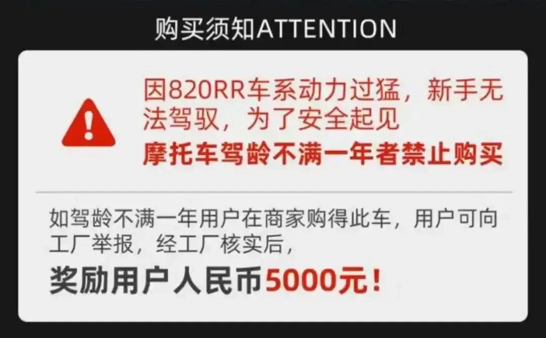 张雪机车仿赛车型820RR对外预订海报显示:因820RR车系动力过猛,新手无法驾驭,为了安全起见,摩托车驾龄不满一年者禁止购买。如驾龄不满一年用户在商家购得此车,用户可向工厂举报,经工厂核实后,奖励用户5000元。