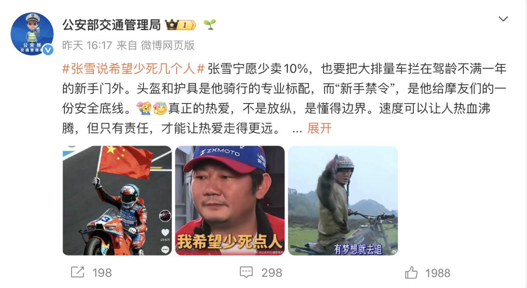 4月1日,@公安部交通管理局 发文力挺张雪。博文提及:张雪宁愿少卖10%,也要把大排量车拦在驾龄不满一年的新手门外。头盔和护具是他骑行的专业标配,而“新手禁令”,是他给摩友们的一份安全底线。真正的热爱,不是放纵,是懂得边界。速度可以让人热血沸腾,但只有责任,才能让热爱走得更远。