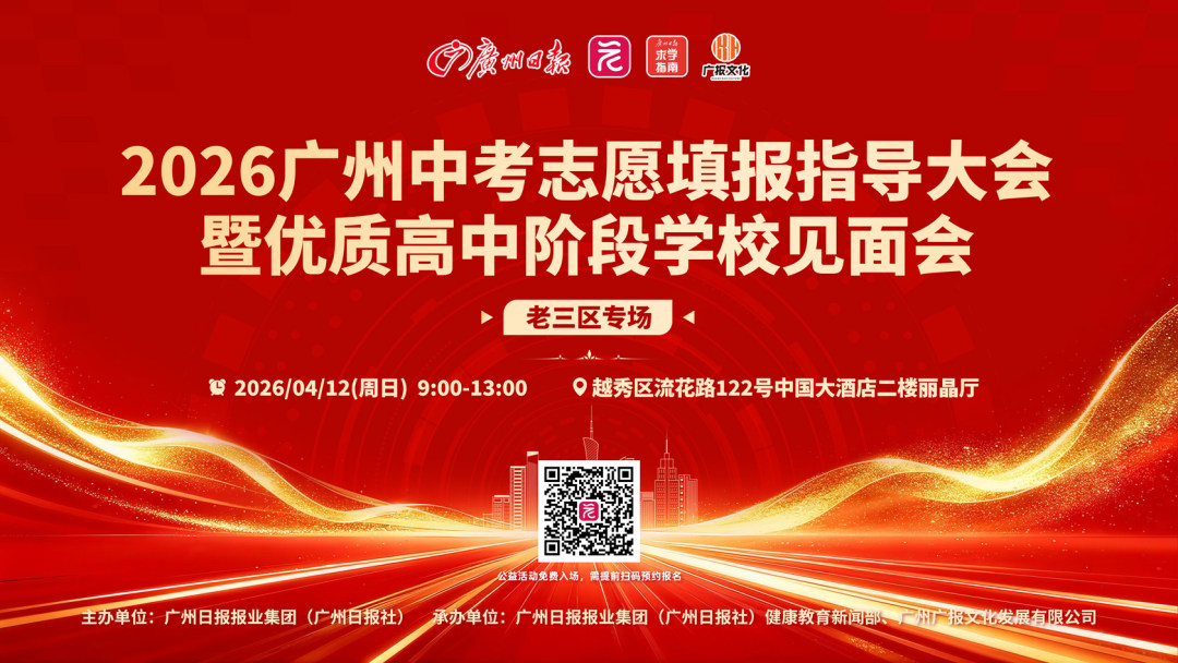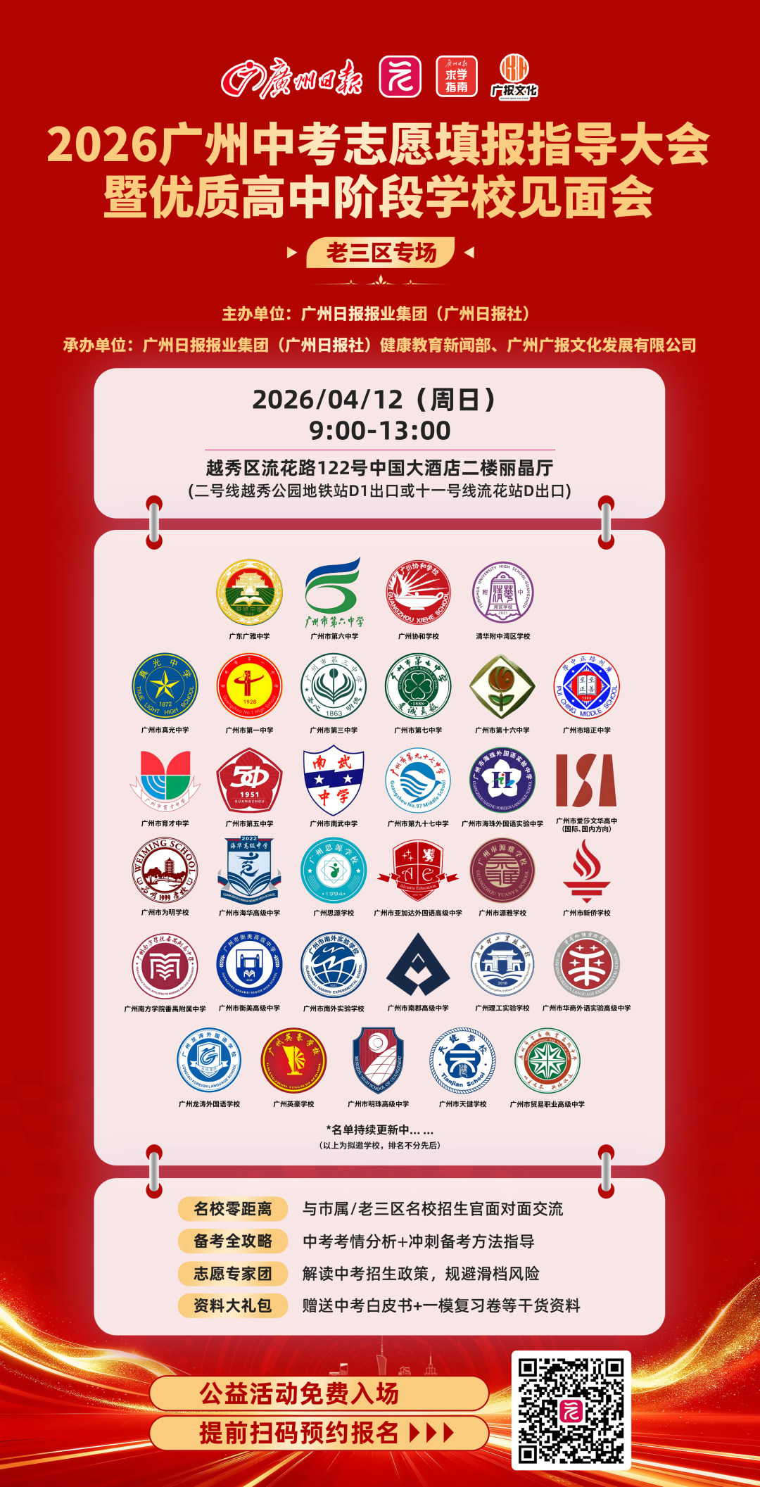 中考临近,面对老三区数十所高中,如何科学择校、合理填报志愿?4月12日,广州日报将在中国大酒店举办“2026年广州中考志愿填报指导大会暨优质高中阶段学校见面会(老三区专场)”,多所名校招生负责人现场答疑,升学专家手把手教您填志愿。文末有详细报名方式,千万别错过!