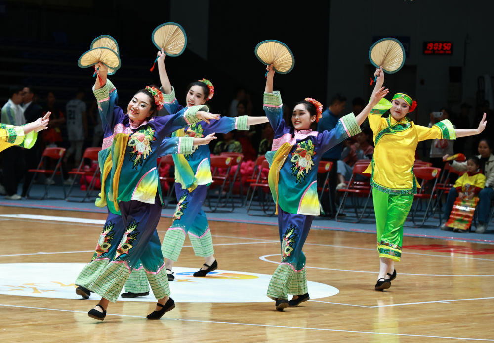 3月28日,在2026年广东省城市篮球联赛比赛中,韶关队主场73:65战胜梅州队。图为赛前进行的表演。新华社记者 黄国保 摄