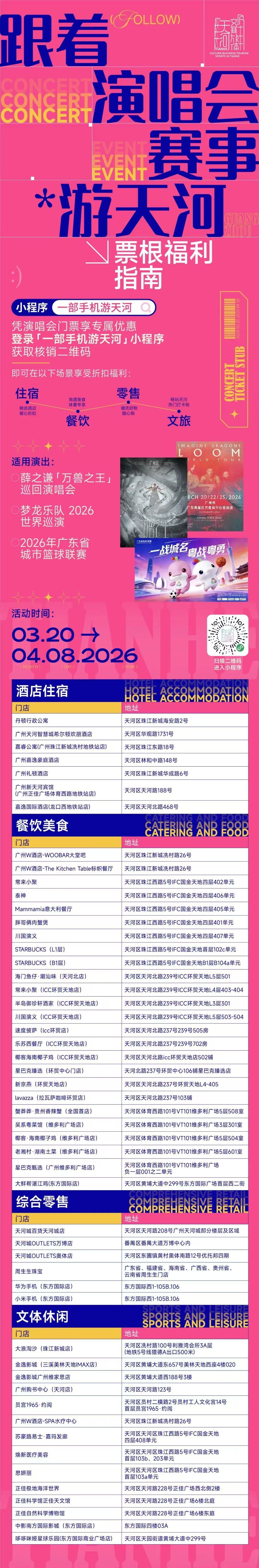 在薛之谦、梦龙乐队演唱会及粤BA赛事期间,天河区“票根经济”持续发力。作为广州率先上线“票根经济”核销功能的城区,消费者凭演唱会、体育赛事票根,即可在正佳广场、广州购书中心、广州ICC环贸天地、天河城百货、粤海天地等100余家优质商户享受专属优惠福利,覆盖住宿、餐饮、零售、文旅等多元场景,一站式满足观演观赛之余的消费需求。