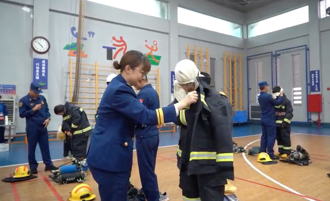 同学们聆听了消防队伍的发展历程和英雄事迹,并在车库近距离接触各类消防车辆和装备。最让大家兴奋的,还要数在室内篮球场开展的互动体验环节。在消防员的帮助下,同学们逐一穿上灭火战斗服,亲身感受消防员出警时的“厚重”与责任。