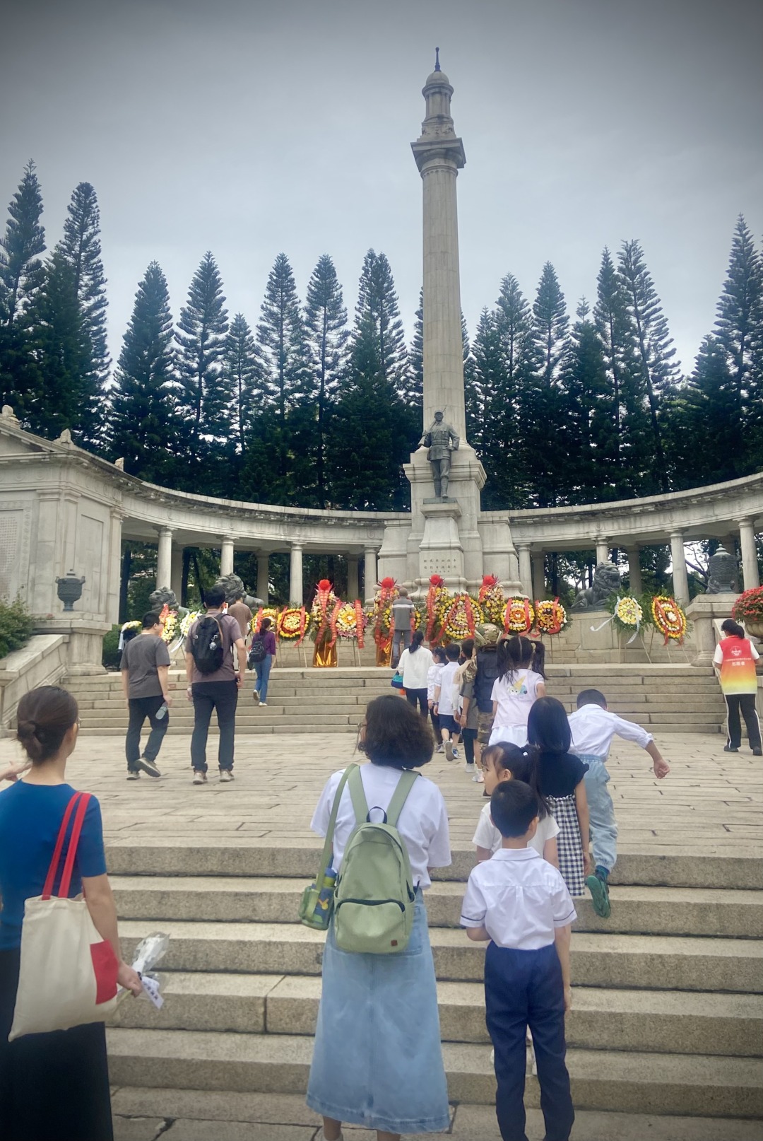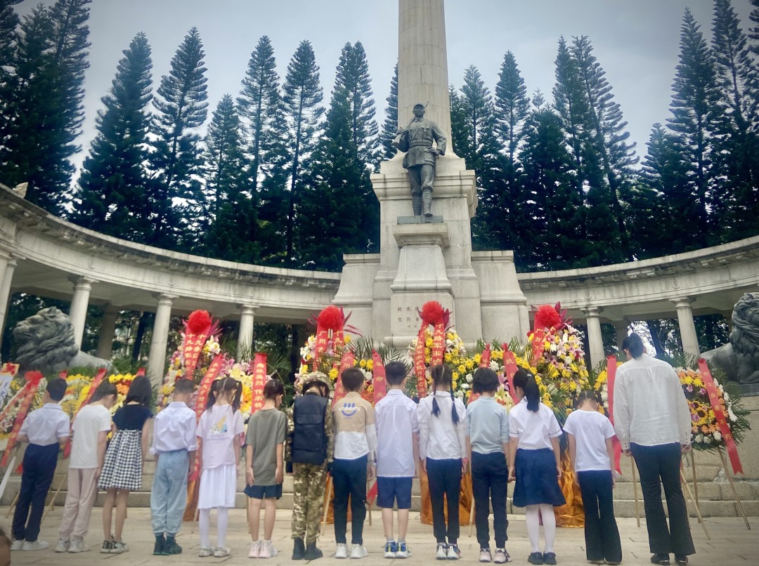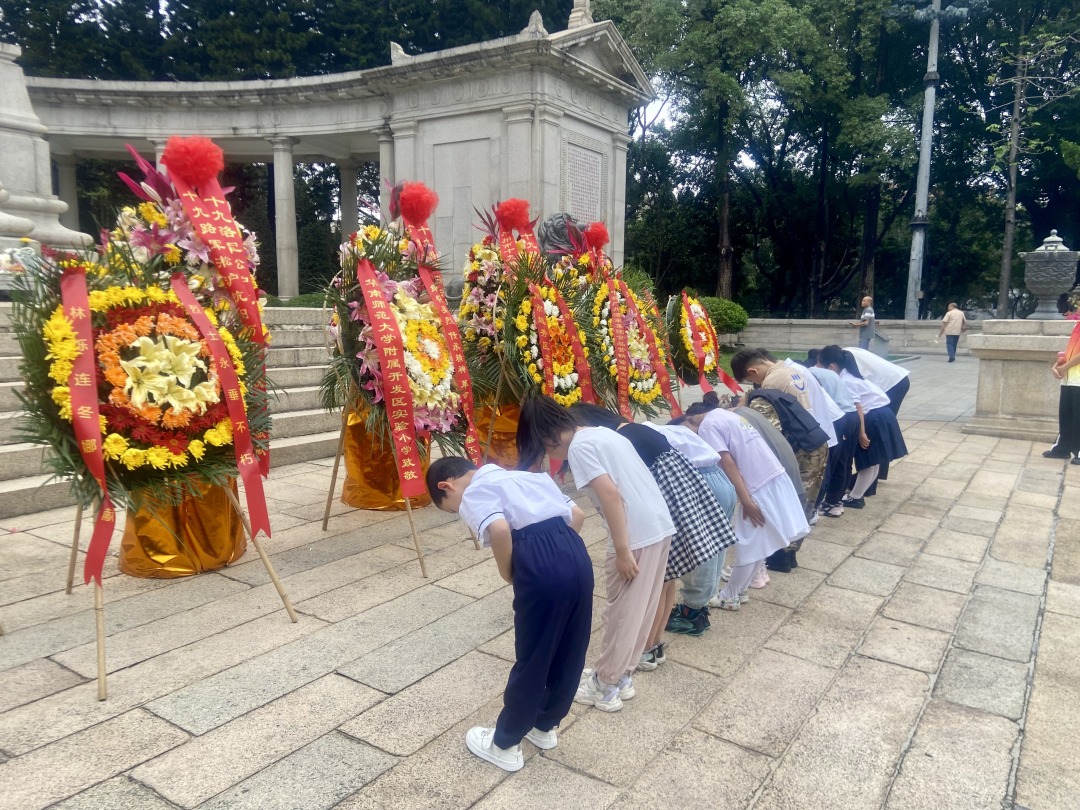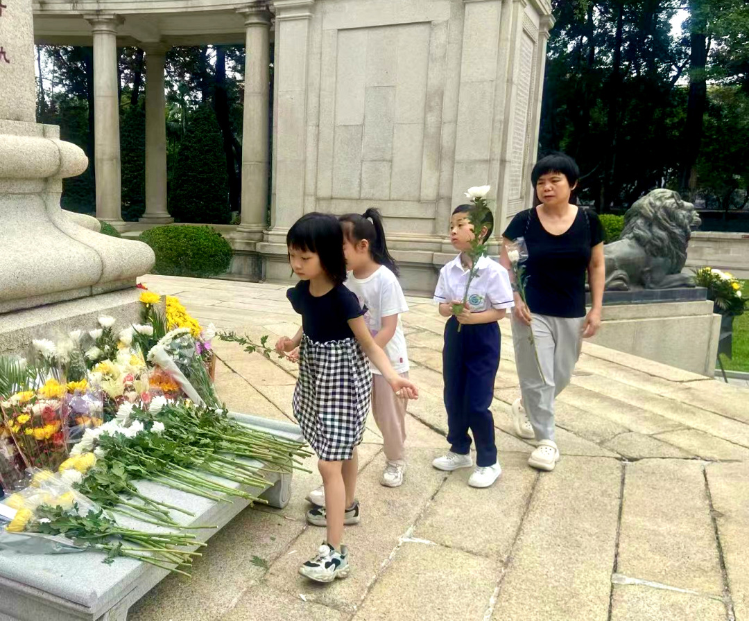 在班主任许穗英带领下,同学们手持菊花默哀,绕行纪念碑一周,将鲜花轻轻放在纪念碑基座上,寄托着少年儿童对英雄的哀思。