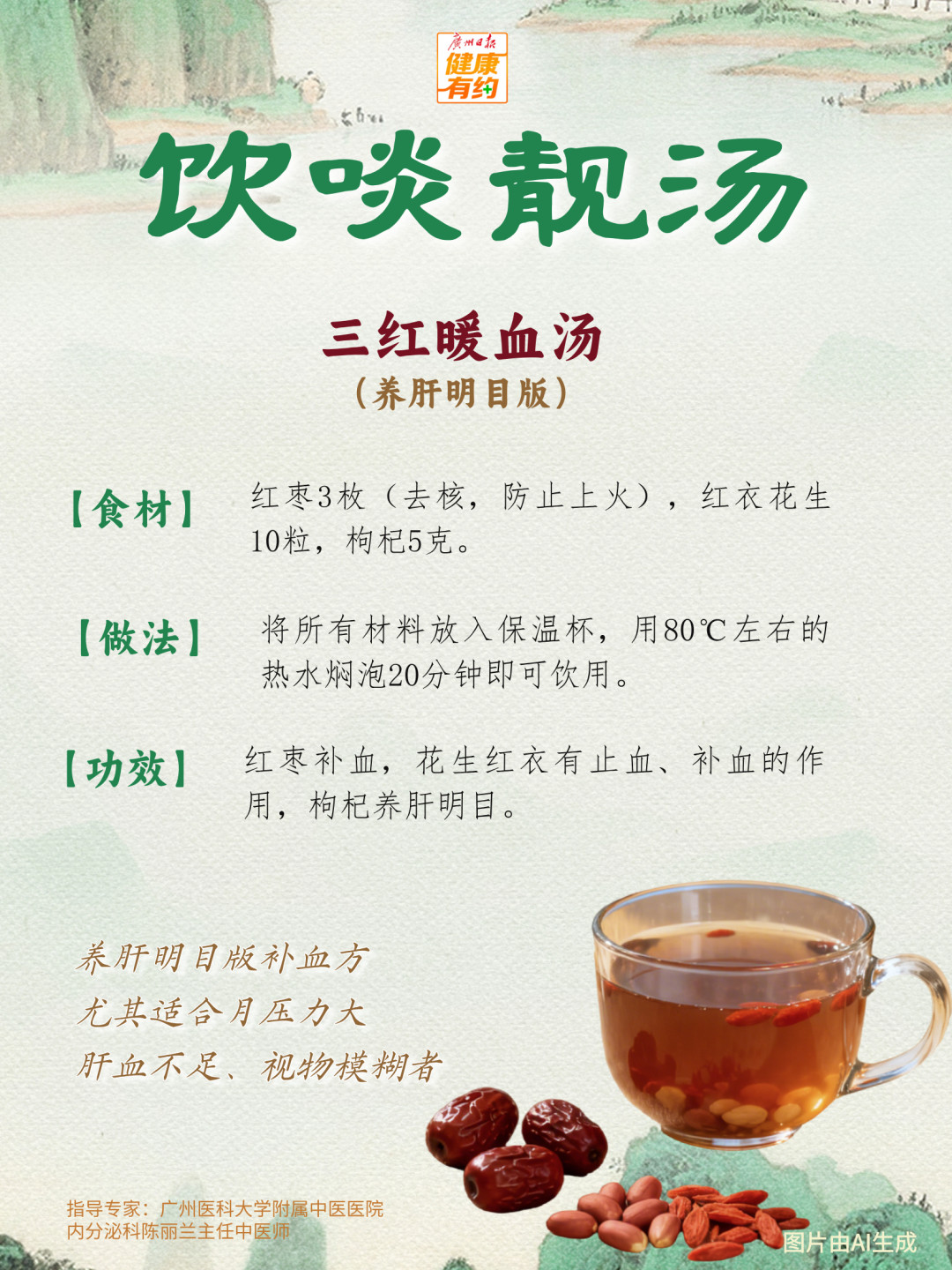 2.补血汤茶偏滋腻,不建议天天喝。一般每周2—3次即可,作为日常调理。
