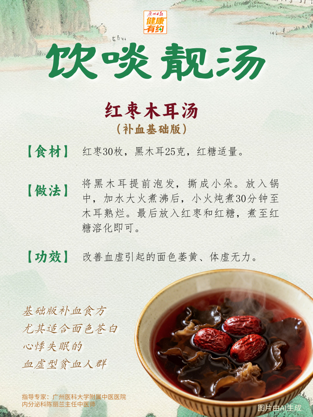 很多人可能低估了熬夜对气血的负面影响。广州医科大学附属中医医院天河院区内分泌科主任陈丽兰主任中医师提醒,中医认为“卧则血归于肝”,长期熬夜会严重耗伤气血。夜间是身体造血和修复的时间,该睡不睡,机体的血气没有时间恢复,造血也没有充足的时间。此外,过度节食或者偏食挑食,体力消耗或者长时间的脑力劳动,也会耗伤心血。此外,对于青春期女生来说,月经周期可能不规律,如果经量过大,也容易导致血虚,气随血脱,自然容易气血不足。以上四道补血食疗方,有需要的朋友不妨一试。
