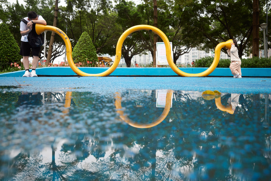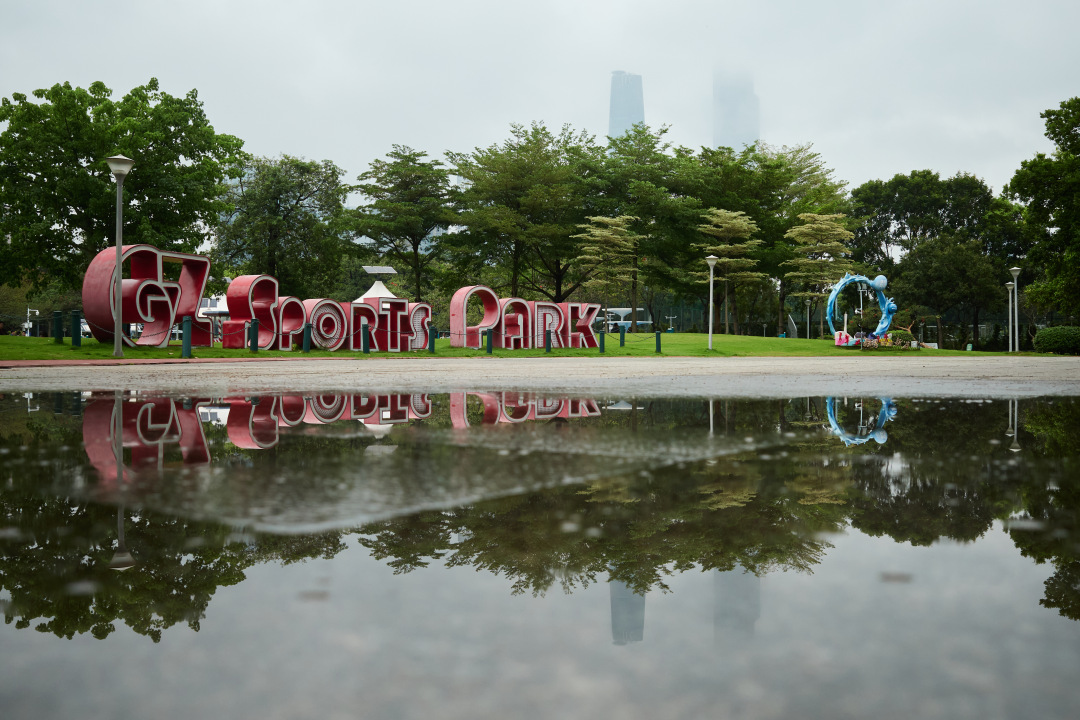 4月6日,二沙岛运动公园,雨后积水倒映出城市的树木与建筑。