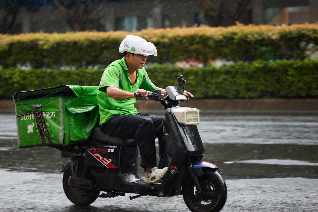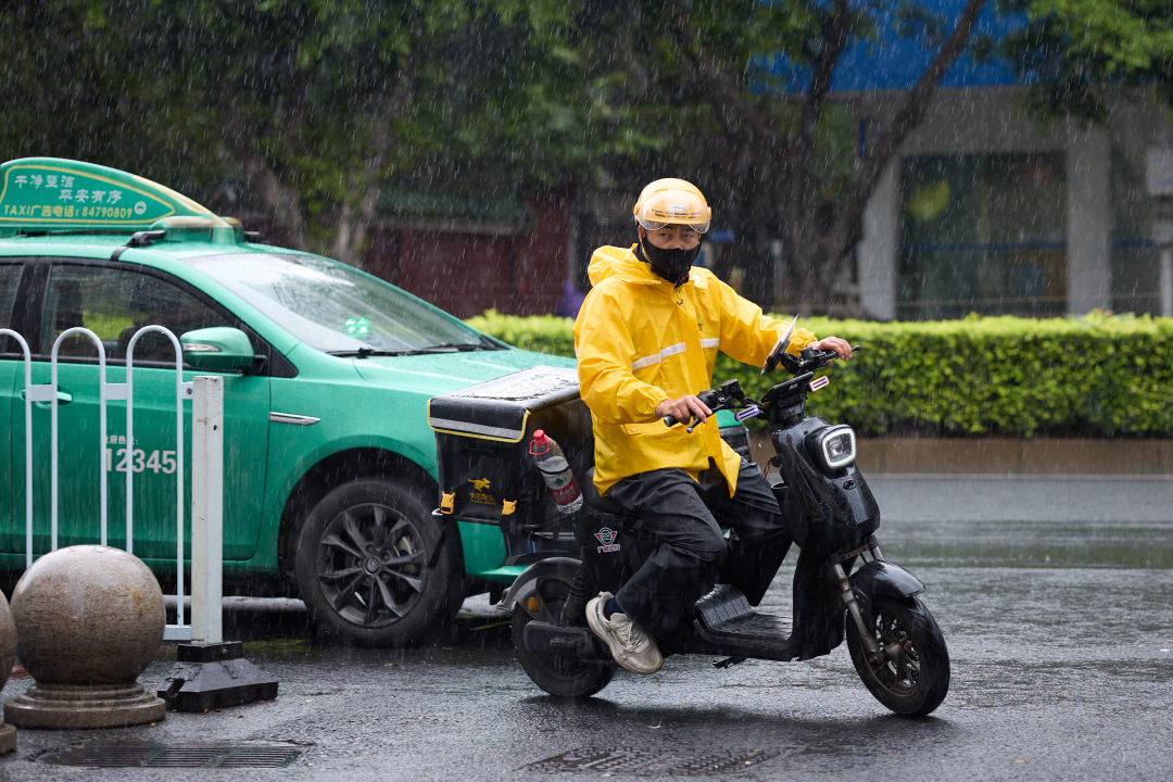 4月4日,中大南门,外卖小哥冒雨骑行。