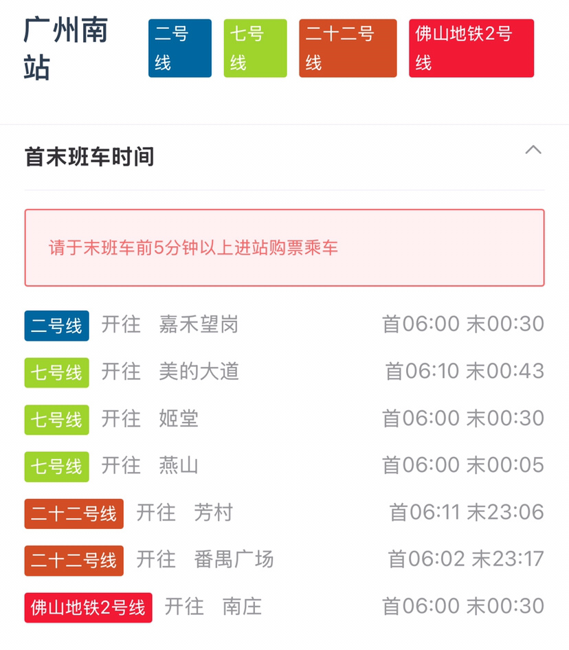 市民可通过广州地铁官方微信订阅号或官方APP查询线网各线路、站点尾班车时间,有延长服务时间的线路,系统所示就是今日的尾班车时间。比如广州南站今晚二号线尾班车在0:30开出。乘客需在尾班车前5分钟以上进站购票乘车。