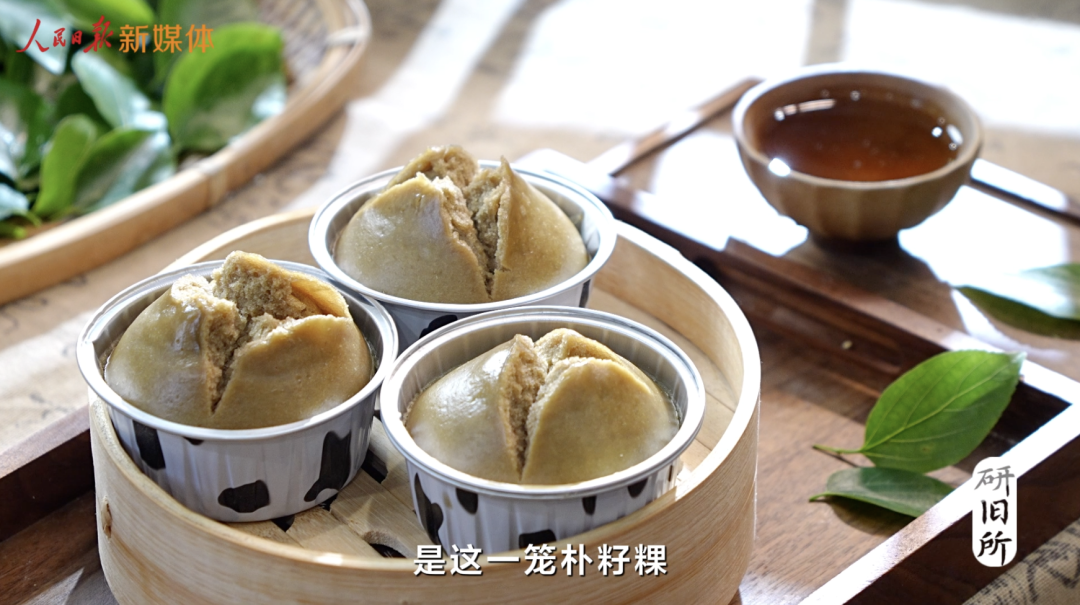 蒸熟的朴籽粿呈浅绿色,顶端自然开裂如“开口笑”,味道甘甜,带有独特清香。
