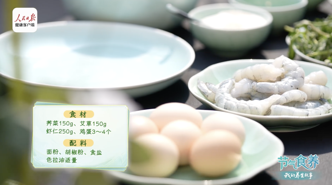 材料:荠菜150g、艾草150g、虾仁250g、鸡蛋3—4个,面粉、胡椒粉、食盐、色拉油适量。做法:荠菜、艾草焯水后切碎,虾仁稍微汆烫,搅拌鸡蛋后加入处理过荠菜、艾草和虾仁,以及加入适量面粉、胡椒粉、食盐,在平底锅加入色拉油后,倒入蛋浆混合液翻煎至煮熟即可。