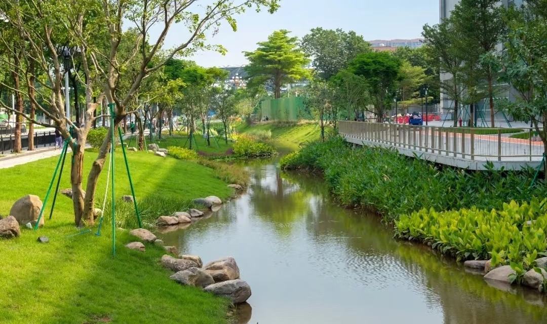 依托“一心一轴一环两核”的规划布局,荔湾区大坦沙岛将绿化建设与人居环境改善紧密结合,致力于实现43%高绿化率目标。一是环岛碧道建设。结合江岸线资源优势,建成1.27公里环岛碧道东岸段,设置透水铺装、雨水花园等海绵设施,开辟“漫步道、缓跑道、骑行道”三道分离的游径空间,极大地提升康体功能,沿途设置景观灯、垃圾箱、救生圈等便民设施,使昔日的江边荒地变成市民休闲健身的“打卡地”。二是中轴线景观提升。针对沙坦涌中轴线区域,构建“一廊四景”(叠浪花境、活力阳台、海绵花园、康养花园)的活力空间系统。沿途种植了花叶美人蕉、长春花等22种观赏性花卉,以及8种乔木与2种灌木,形成层次分明、四季有景的生态空间。三是城市微更新与“光亮工程”。在城中村改造过程中,同步推进环境整治,投入 800万元对桥中南路全线进行升级改造,施工面积达2万平方米。实施“光亮工程”,投入 50多万元新装和更换街灯107盏,加装视频监控30个,不仅美化市容,也提升居民的安全感。