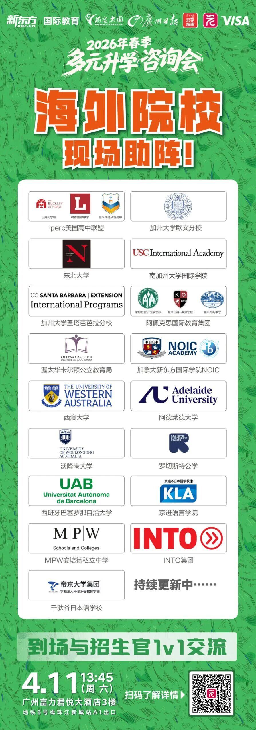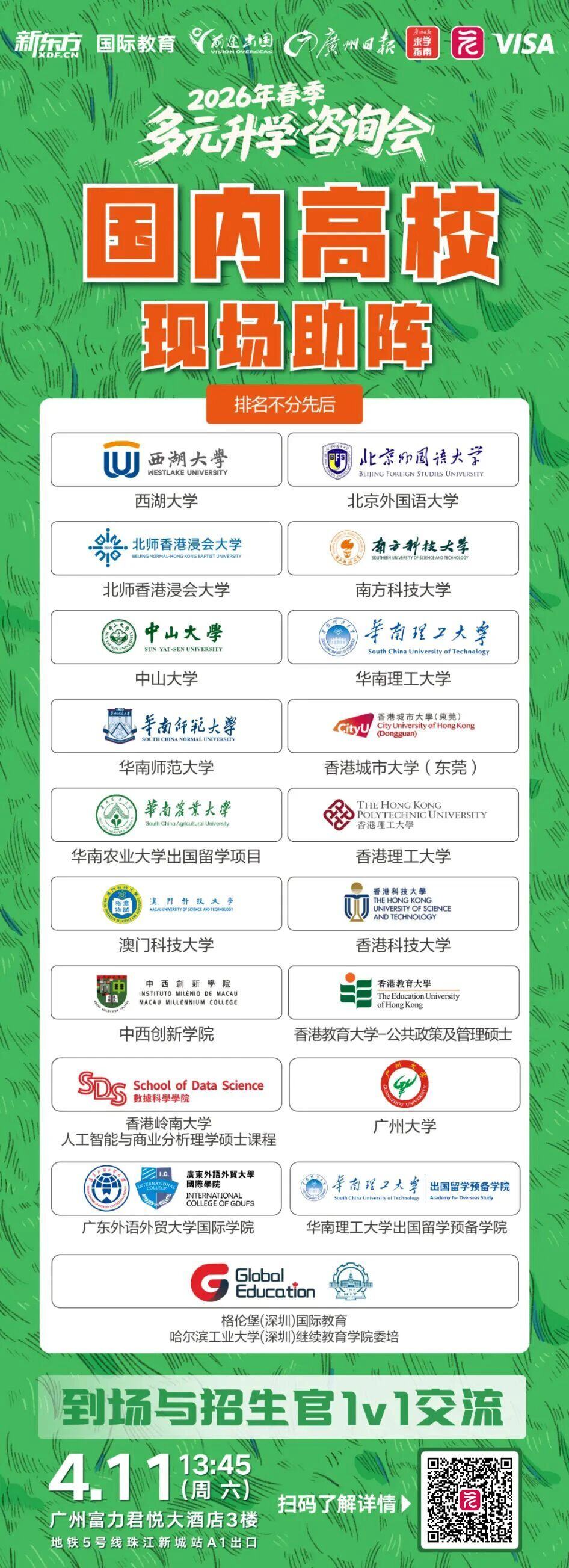 今年各校综评招生计划是否增加?各校综评招生又有什么新变动?4月11日(周六)13:45—18:00,广州日报报业集团(广州日报社)携手新东方国际教育广州中心,倾力打造“2026年多元升学咨询会”,众多学校招生老师届时将莅临现场,为考生和家长提供面对面咨询。