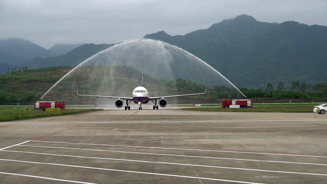 4月7日上午,韶关丹霞机场停机坪上,两道弧形水柱凌空交汇。一架从云南飞来的A320客机徐徐穿过这道民航最高礼仪的“水门”,稳稳落地。