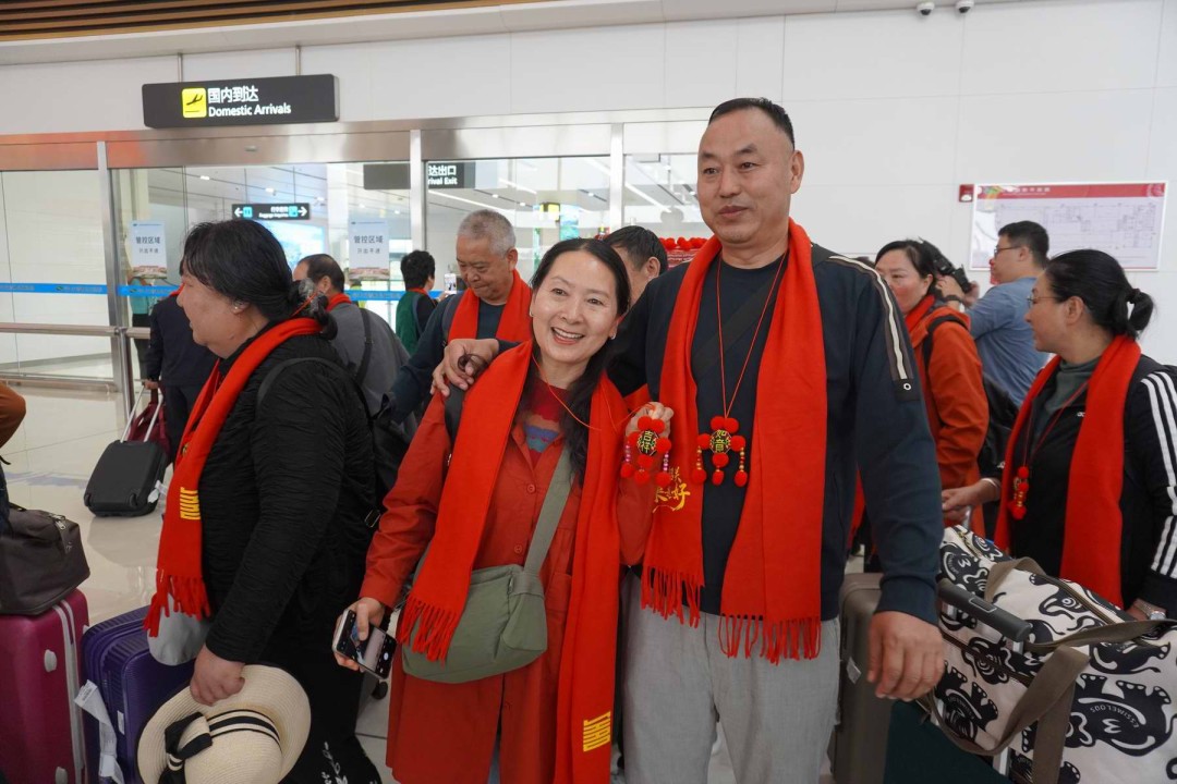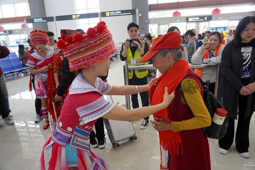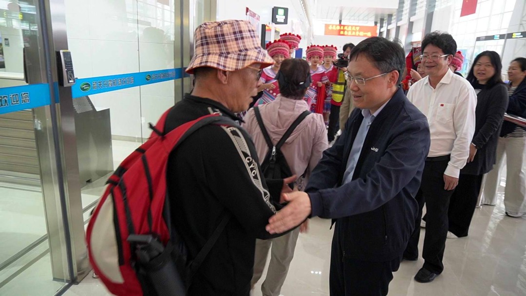 当抵达厅的大门开启,180余名来自云南的游客鱼贯而出,盛装来迎的瑶族同胞,将一枚枚非遗瑶绣吉祥物挂件递上,一条条红艳艳的围巾系在客人颈间。