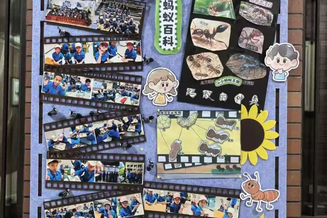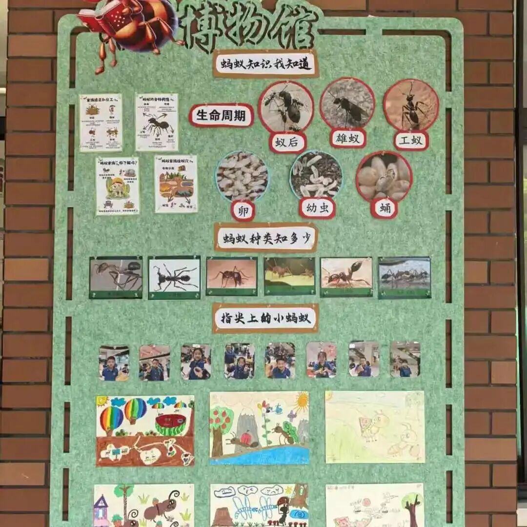 小北路小学一年级各班教室外的墙面,被打造成充满童趣的“一平方米博物馆”,成为探秘蚂蚁王国的神奇窗口。展馆内设置趣味科普区,以生动活泼的形式,向大家介绍蚂蚁的种类、分工、身体结构与生长周期;成果展示区则整齐陈列着孩子们的研学手册、蚂蚁主题画作、手工头套及研学风采照片,清晰回溯每一段探究足迹。方寸墙面,满载童真与好奇,让孩子们在沉浸式参观中,与小蚂蚁开启一场奇妙的科学邂逅。