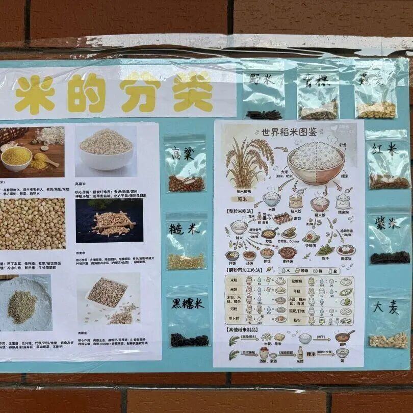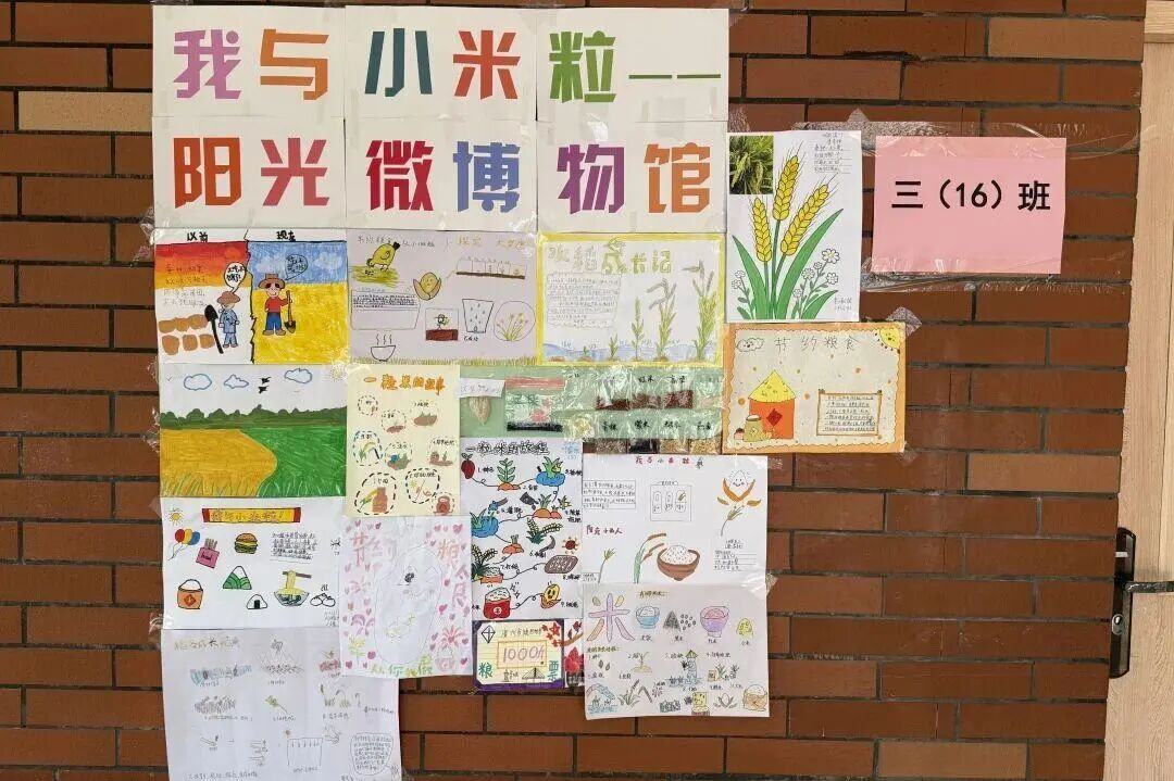 三年级以“我与小米粒”主题,亮点纷呈、童趣满满。馆内陈列着各式各样的谷物标本,生动展现水稻从播种到成熟的完整生长过程,孩子们与水稻小苗的合影、袁隆平爷爷躬耕田野的事迹也一一呈现。更有孩子们亲手绘制的创意粮票,广州塔、五羊雕像等羊城元素跃然纸上,独具巧思。方寸之间,孩子们在参观与创作中认识稻米、感知劳动艰辛,让惜粮爱粮、感恩劳动的品质深深扎根心底。