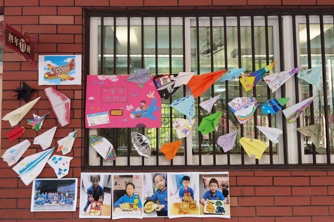 四年级以“我是小飞机”主题,成为承载蓝天梦想的起航点。各班门前的方寸展区,集中展示了一周研学成果:既有介绍航天、航母及各类飞机知识的科普海报,也有形态各异的创意折纸飞机。尤为引人注目的是,孩子们设计的精美登机牌与模拟飞机餐,将研学体验延伸至航空服务的细微之处。