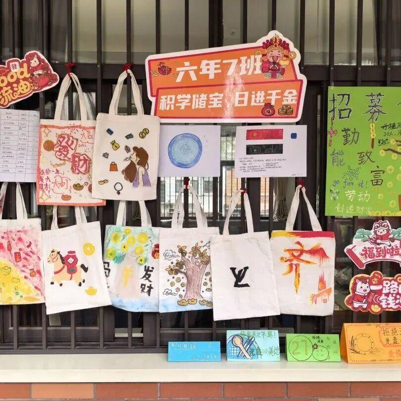 六年级以“我与小钱罐”主题,作品凝聚着孩子们的财商智慧与巧思。各班巧妙利用教室门口一平方米空间,陈列着精打细算的茶楼菜单、实时更新的基金认购单,尽显理财意识;《劳动就是财富》版块,手绘招贤纳士宣传画再现职聘现场,诠释劳动创造价值的真谛。形态各异的小财神帽、手绘钱袋传递美好寓意,详实的家庭开支计划,见证着当家责任感的萌芽。这一方小天地,是财商教育的生动延伸,让孩子们领悟“取之有道、用之有度”的财富智慧。