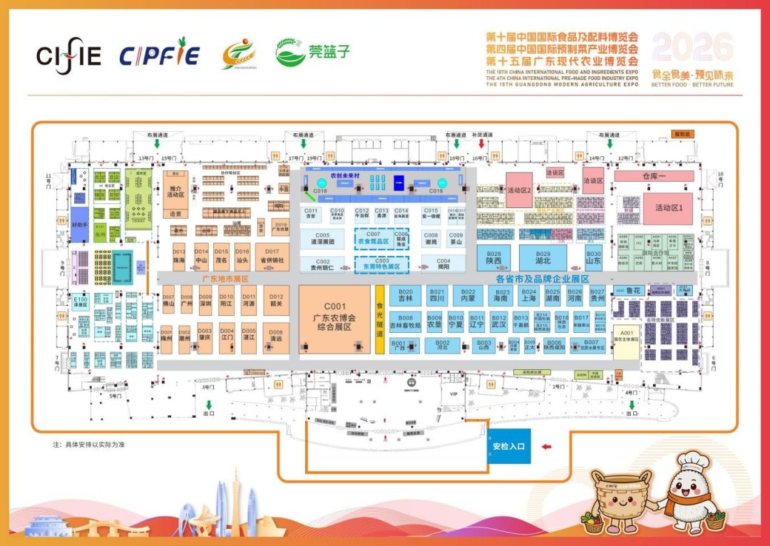广东综合展示区(C001)——四川展区(B021)——益海嘉里展区(C014)——信立区(F区)——广东推介活动区(D区)——陕西展区(B016)——贵州展区(B027)——新疆展区(A106)——国际展区(斯里兰卡馆)——名特优新展区(A068)