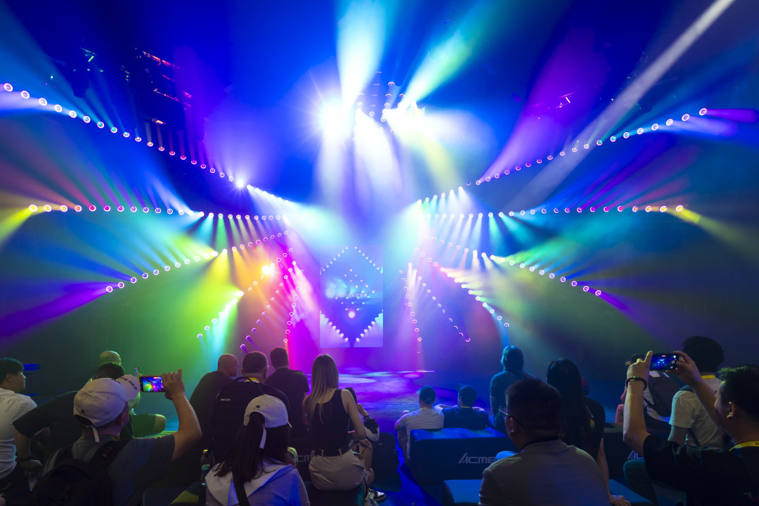 观众在展位观看灯光秀,体验不同灯光型号的效果。