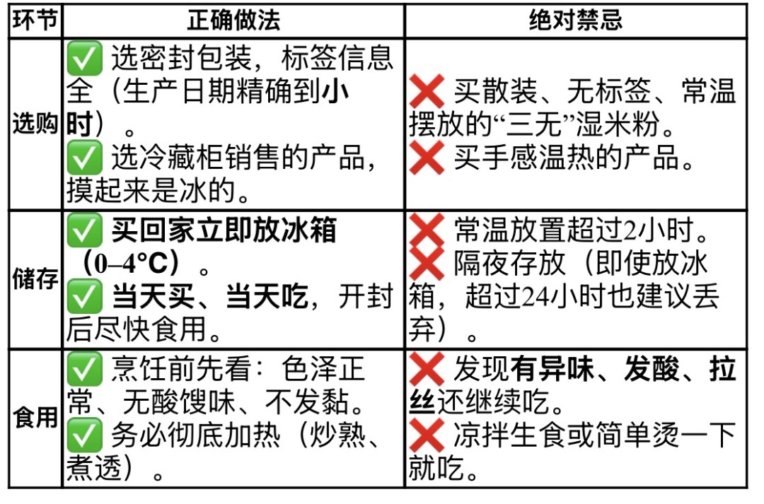 烹饪前先看湿米粉色泽正常、无酸馊味、不发黏再食用;务必彻底加热(炒熟、煮透);发现有异味、发酸、拉丝不要继续食用;不要凉拌生食或简单烫一下就吃。