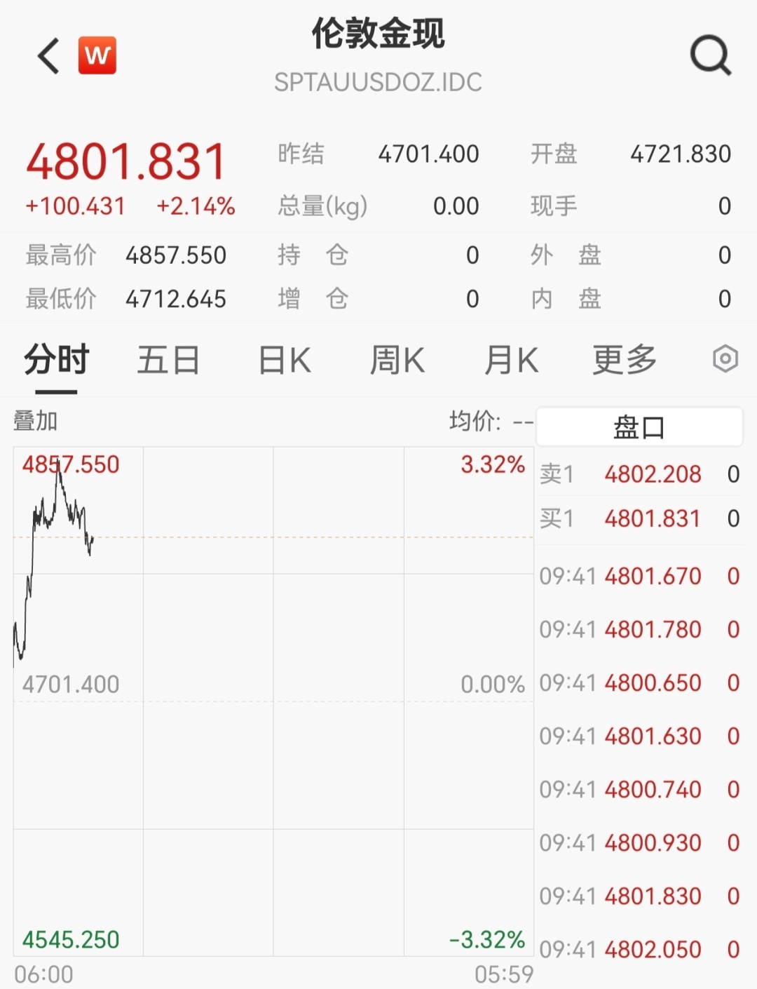 地缘冲突缓解,国际金价和银价迅速拉升。截止到北京时间9时41分,现货黄金涨破每盎司4800美元。
