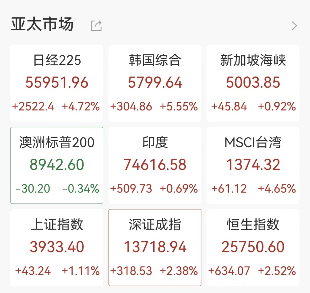 当日早盘,日韩股市开盘大涨,韩国交易所于KOSPI 200期货上涨5%后,启动KOSPI指数熔断机制,程序化交易暂停5分钟。截至9点31分,日经225指数上涨4.72%,韩国综合指数大涨5.55%。