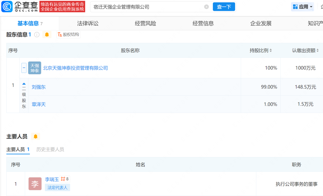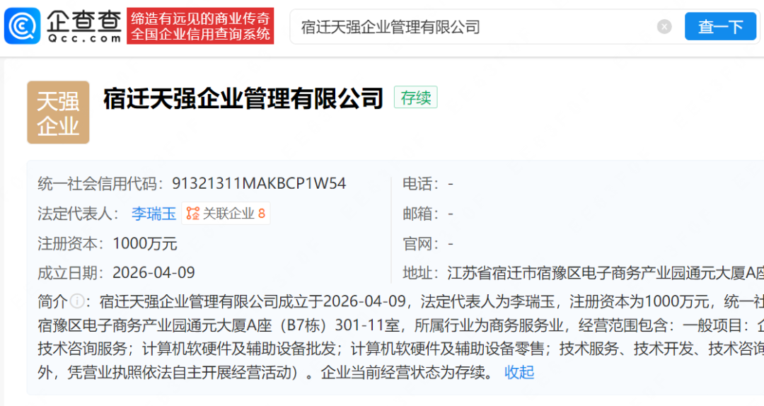 4月9日,企查查App显示,近日,宿迁天强企业管理有限公司成立,法定代表人为李瑞玉,注册资本为1000万元,经营范围包含企业管理、信息技术咨询服务、计算机软硬件及辅助设备批发等,由北京天强坤泰投资管理有限公司全资持股,后者由刘强东、章泽天共同持股。