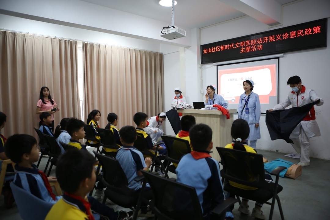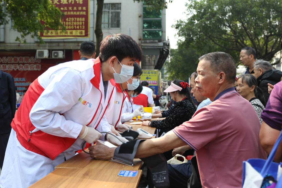 在广东清远市佛冈县龙山镇,义诊摊位前的医护学子正为老人仔细测量血压,还不忘叮嘱几句日常健康注意事项;在羊角山徒步穿越活动中,身着红马甲的青年志愿者迎着晨曦早早集结,为数千名参与者提供引导和保障;在水头镇的乡村小学里,学生们正跟着医护专业的大哥哥、大姐姐学习心肺复苏和海姆立克急救法……
