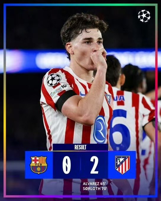 全场技术统计显示,巴萨还是占据明显优势的,但比赛的胜负手出现在第44分钟,朱利亚诺·西蒙尼前插获得单刀机会,跟防的库巴西将其撞倒,经VAR介入,主裁判将库巴西红牌罚下,导致巴萨大部分时间少打1人。随后,马竞连下两城,其中,阿尔瓦雷斯任意球直接破门,他单赛季欧冠取得9个进球和4个助攻,“小蜘蛛”创马竞球员纪录。