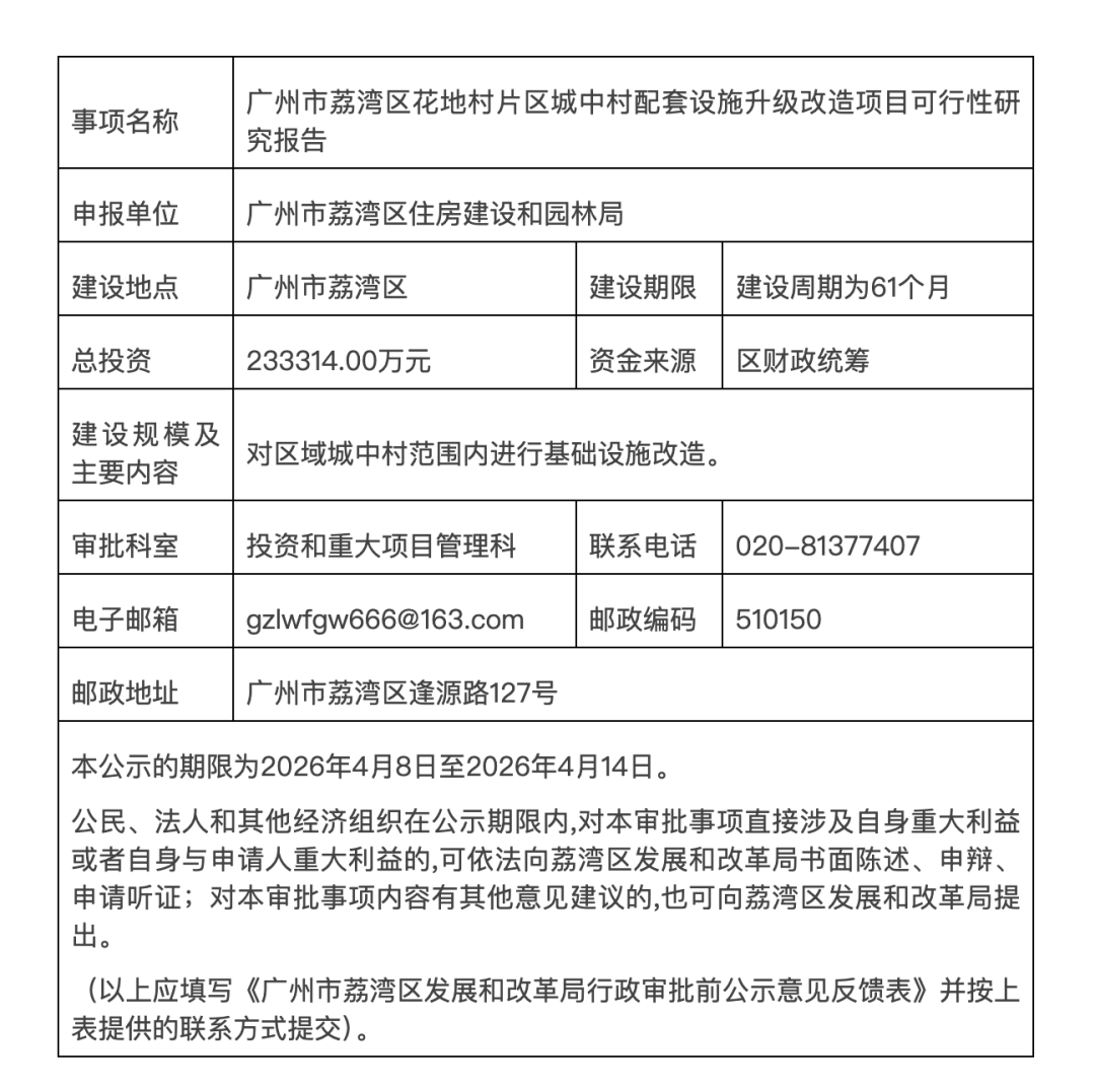 4月8日,广州荔湾区公布花地村片区城中村配套设施升级改造项目可行性研究报告审批前公示表,荔湾拟投资23.3314亿元对花地村城中村范围内进行基础设施改造,资金来源为区财政统筹,建设周期为61个月。