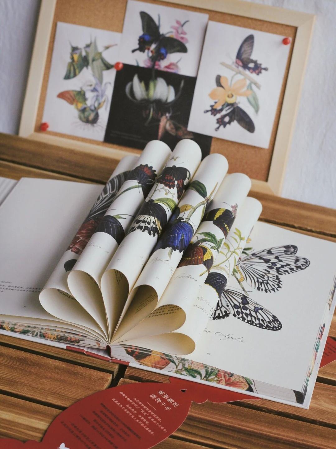 《蝶之恋》这本书精选了多诺万与韦斯特伍德两位博物画家/昆虫学家的作品。他们的插画远不只是冷冰冰的科学图版,而是充满“自然现场感”的生命瞬间:翅膀的纹理、触角的姿势、背景植物的色彩,都让人仿佛能感到空气在画面中流动。它们采用雕刻印刷加手工上色的方式呈现,至今仍让人惊叹。
