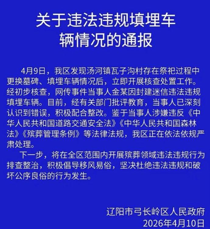 4月9日,弓长岭区发现汤河镇瓦子沟村存在祭祀过程中更换墓碑、填埋车辆情况后,立即开展核查处置工作。经初步核查,网传事件当事人金某因封建迷信违法违规填埋车辆。
