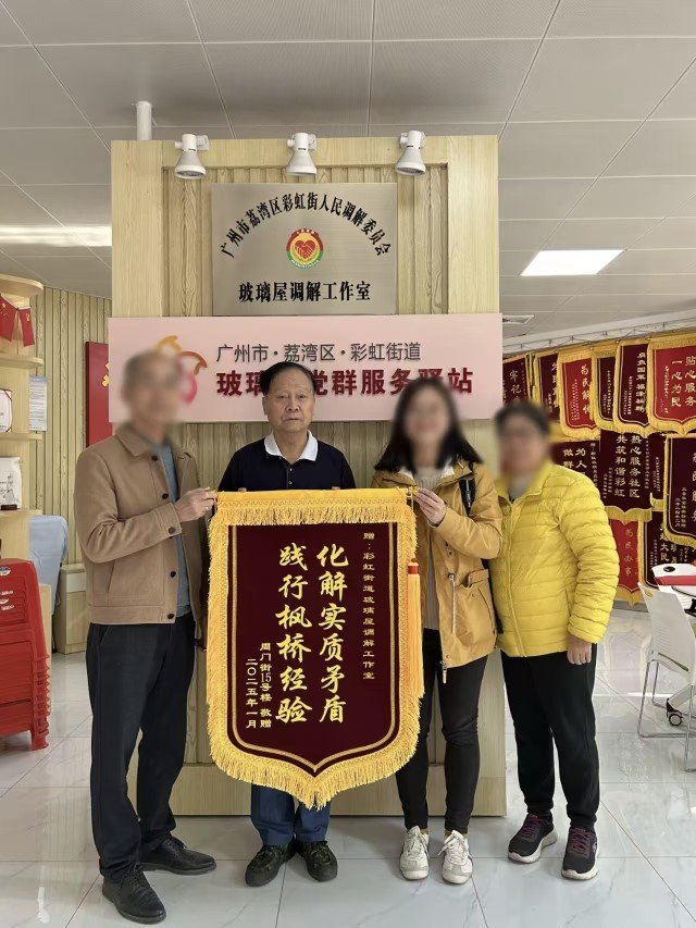 在广州荔湾区彩虹街道,有一间不足40平方米的“玻璃屋”矛盾纠纷调解工作室。屋里最醒目的,是那面挂满120余面锦旗的墙,每一面锦旗都诉说着一个邻里从争执到言和的故事。而故事的主角,正是78岁的老党员、优秀人民调解员董义德,街坊们亲切地叫他“董叔”。