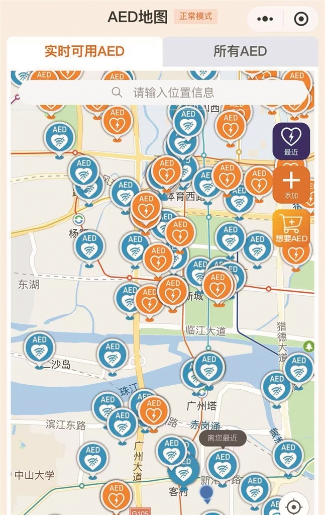 市民寻找周边的AED目前主要可以通过两种途径,一是通过微信小程序,二是通过地图软件。当前,仅在广州市范围内能使用的AED线上地图的微信小程序就有将近10款。再加上像高德、百度等地图软件,可以说,线上寻找AED的选择颇丰富。